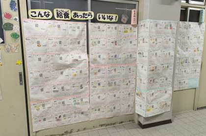 夏休みに1年生から4年生が考えた「こんな給食あったらいいな!」をテーマにした献立を正面玄関入って左すぐの食育ルーム前に展示しています。おいしそうで、とてもユニークな作品がたくさんあります。5.6年生の作品は大阪府の献立コンクールに参加しています。