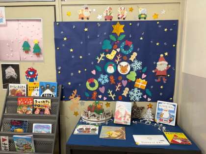 図書室前には、クリスマスのかわいい掲示とクリスマスに関する本が並べられています。