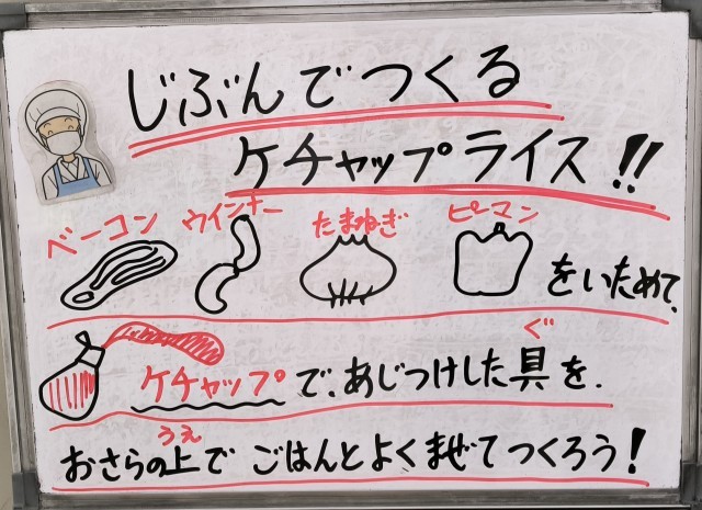 今日は、ケチャップライス、スープ、れんこんフライ、牛乳でした。