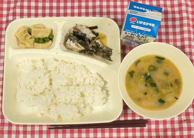 19日(金)は、いわしのしょうが煮、みそ汁、高野どうふの煮もの、ご飯、牛乳でした。