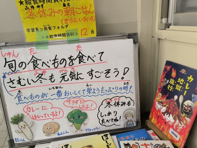 今日は、冬野菜のカレーライス、ブロッコリーとコーンのサラダ、和なし(カット缶詰)、牛乳でした。可愛らしいラッキー人参などもあり児童に大好評でした。