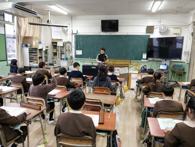地域のそろばん教室の指導者を講師にお招きし、3年生にはじめてのそろばん学習を教えていただきました。