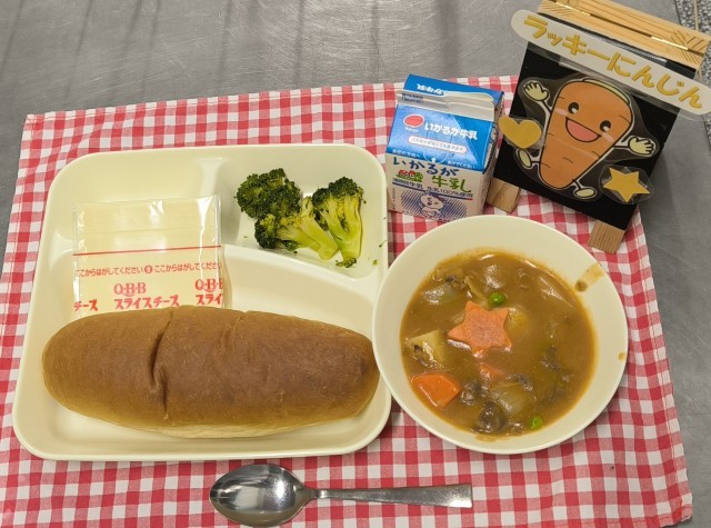今日は、ビーフシチュー、ブロッコリーのサラダ、スライスチーズ、黒糖パン、牛乳でした。可愛らしい形のラッキー人参も用意してくれました。