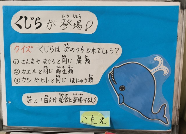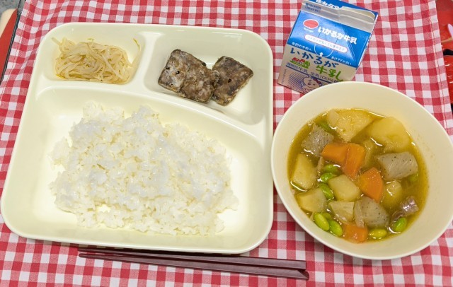 今日は、くじらのたつたあげ、豚肉とじゃがいもの煮もの、もやしの甘酢あえ、ご飯、牛乳でした。