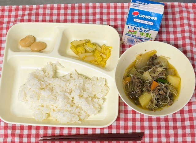 6日給食は、肉じゃが、はくさいのゆず風味、白花豆の煮もの、ご飯、牛乳でした。