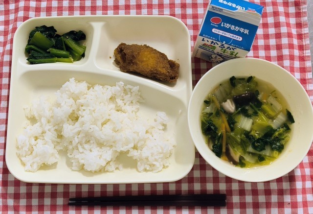今日は、たらフライ、うすくず汁、こまつなのごま和え、ご飯、牛乳でした。