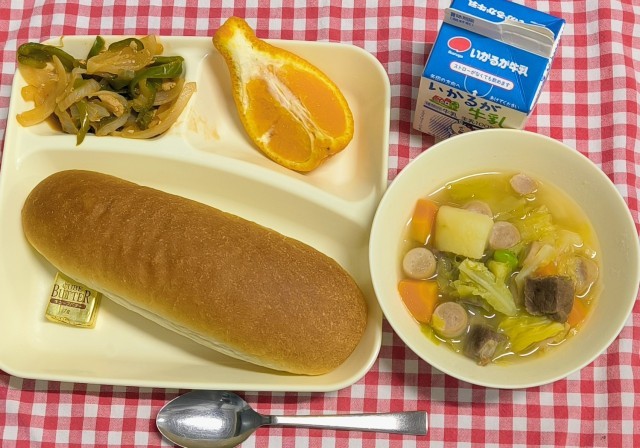 10日は、ポトフ、鶏肉と野菜のケチャップソテー、デコポン、コッペパン、バター、牛乳でした。