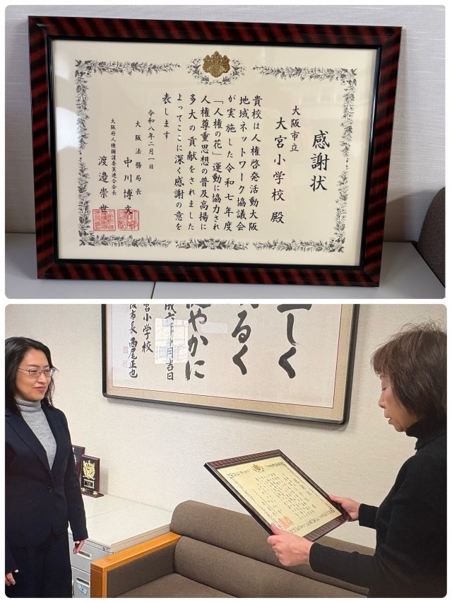 大阪市法務局、大阪府人権擁護委員会連合会より、「人権の花」運動への協力に対する感謝状をいただきました。