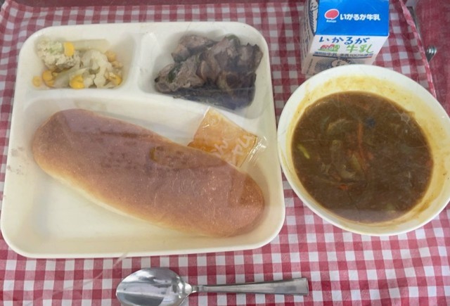 今日は、豚肉の香味焼き、カレースープ、カリフラワーとコーンのサラダ、コッペパン、みかんジャム、牛乳でした。