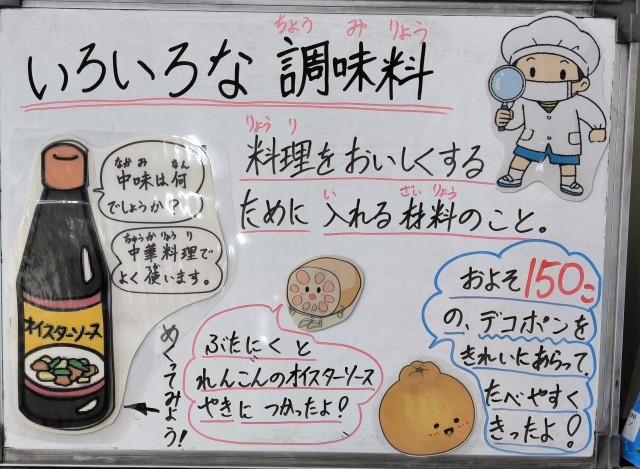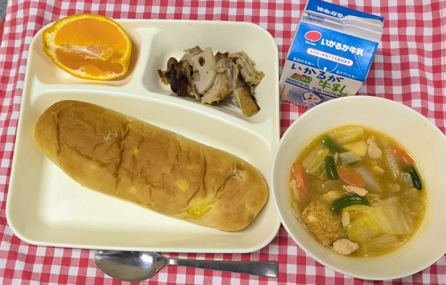 今日は、豚肉とれんこんのオイスターソース焼き、鶏肉とあつあげのうま煮、デコポン、おさつパン、牛乳でした。