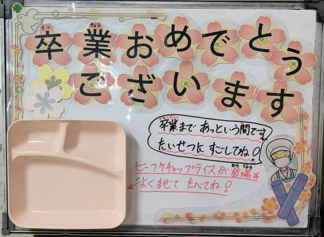 今日は、6年生の卒業をお祝いする特別献立でした。自分で混ぜて仕上げるビーフケチャップライスの他、キャベツのスープ、フライドポテト、みかんゼリーの彩り良い組み合わせにしました。