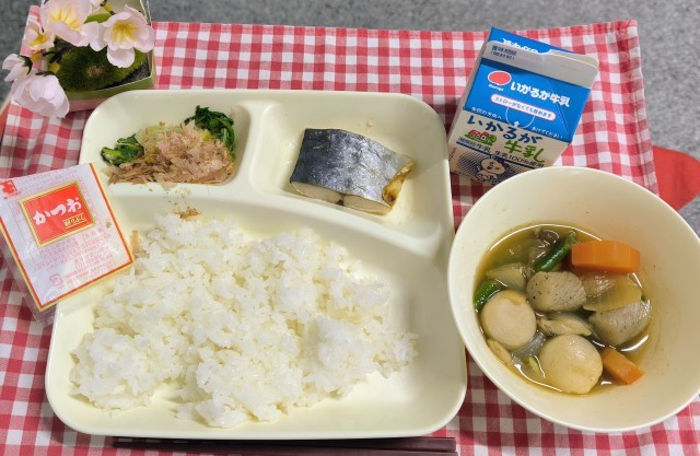 今日は、さごしの塩こうじだれかけ、さといもと野菜の含め煮、なのはなのおひたし(かつおぶし)、ご飯、牛乳でした。