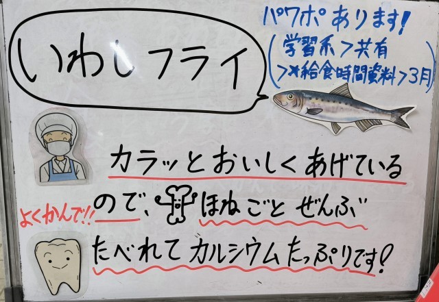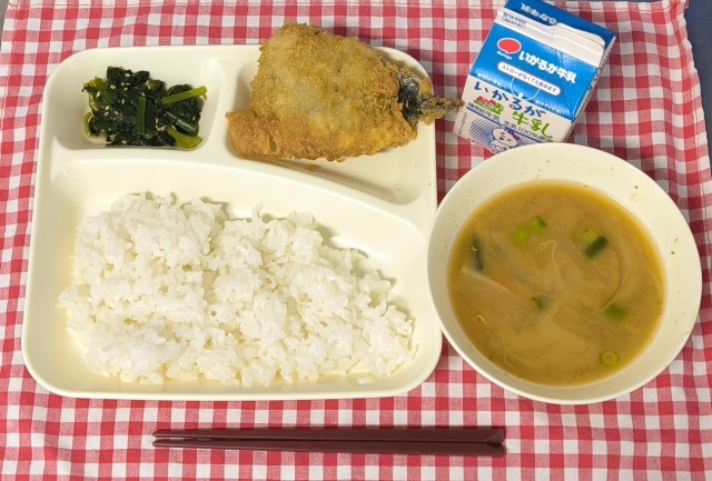 今日は、いわしフライ、みそ汁、ほうれんそうのごまあえ、ご飯、牛乳でした。