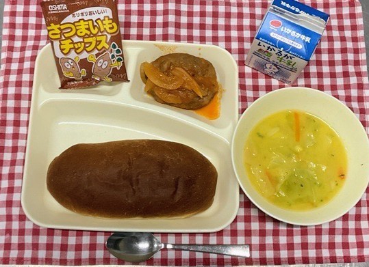 初日は煮込みハンバーグ、コーンスープ、おさつチップス、黒糖パン、牛乳の組み合わせでした。1年生にも食べやすいメニューにしました。