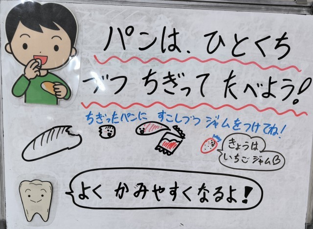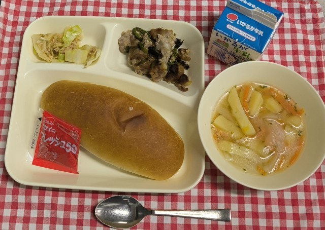 今日は、豚肉のガーリック焼き、スープ、ツナとキャベツのソテー、コッペパン、いちごジャム、牛乳でした。
