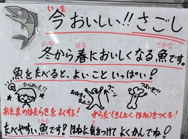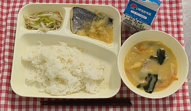 さごしのおろしじょうゆかけ、みそ汁、もやしとピーマンのいためもの、ご飯、牛乳でした。