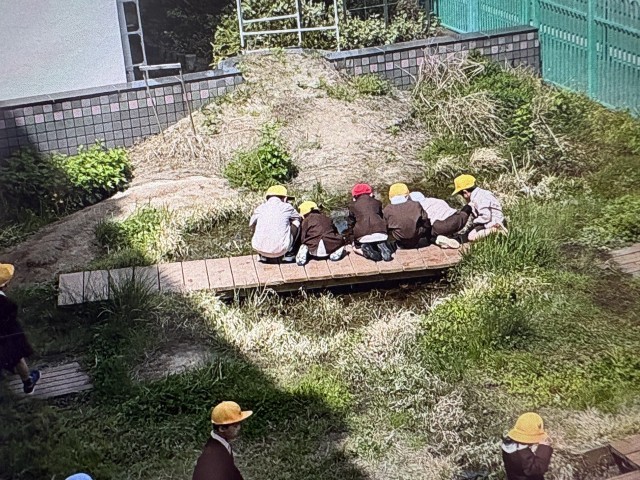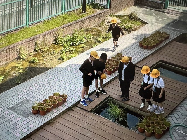 ビオトープで虫やメダカ、小さな生き物たち、草花を観察に来る子どもたちが増えています。