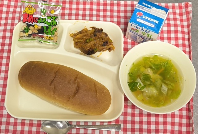 今日は、じゃがいものミートグラタン、レタスのスープ、豆こんぶ、黒糖パン、牛乳でした。