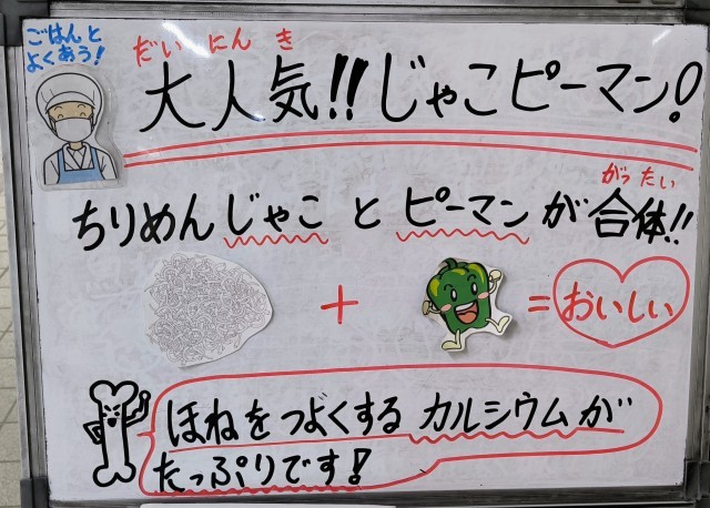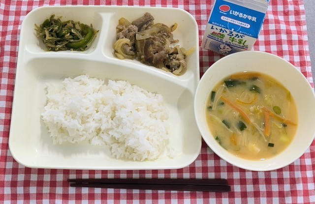 今日は、豚肉の甘辛焼き、とうふのみそ汁、じゃこピーマン、ご飯、牛乳でした。