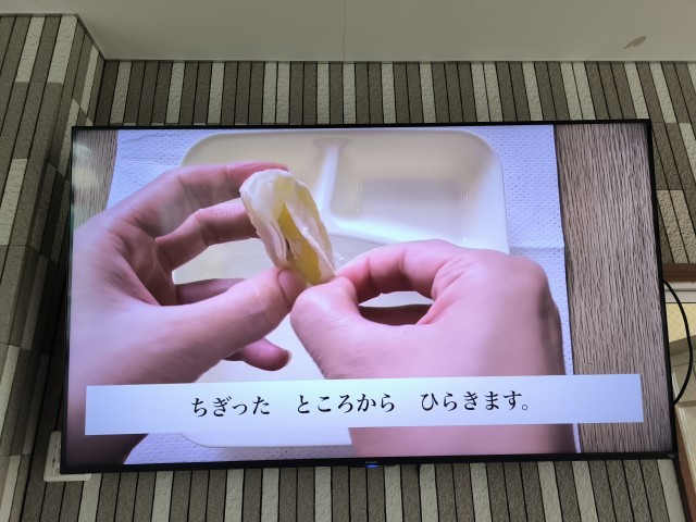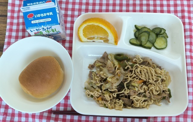 今日は、焼きそば、きゅうりのしょうがづけ、あまなつかん、ミニコッペパン、牛乳でした。甘夏かんは初めて食べるという1年生も皮むき名人にチャレンジしていました。