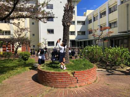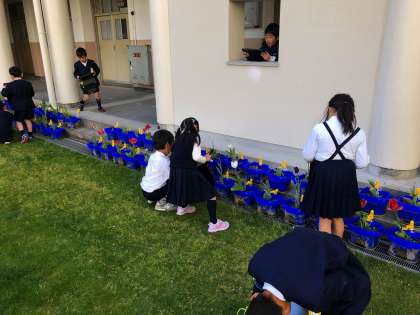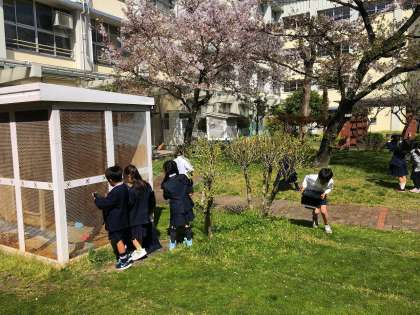晴天の中庭、2年生が一人に一つタブレットを持って、春を見つけていました。まずは、自分たちが育てたチューリップを撮影。その後は、少し葉が混じった桜。ウサギ小屋で寝ている「ココア」。ホームページの取材をしている校長先生もついでに撮影。