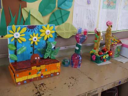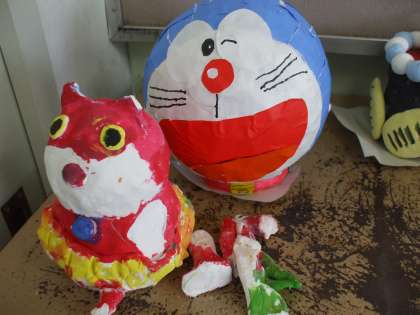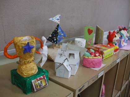 授業の様子を見て回っていると、教室の後ろにあるロッカーの上に、夏休みに完成させた作品が並んでいました。すべてをお見せすることはできませんが、随時、掲載していきます。