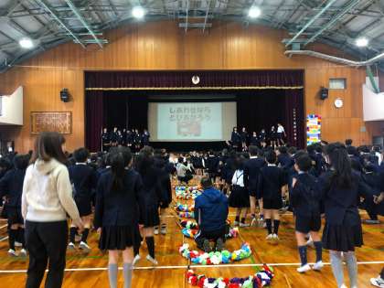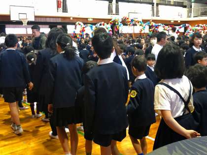 6年生に手を引かれて、体育館に入場。2年生以上のみんなで、改めて「おめでとう」とお祝いをしました。