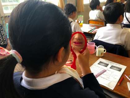 また、歯垢の残量を見ることができる試薬を歯に塗って、利き手側の歯に多く歯垢が残っていることなど、自分の磨き残しやす部位を知ることもできました。磨き残しは歯ブラシできれいに磨いて、次回からの歯磨きでも気をつけることができそうです。
