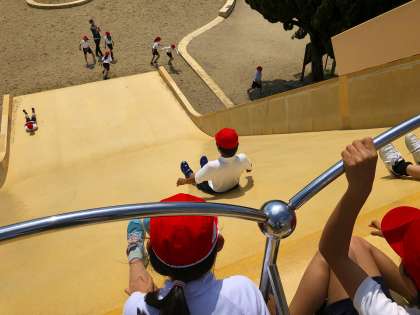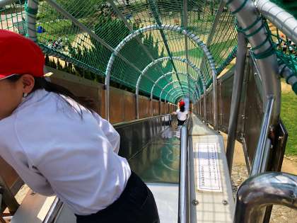 さわやかな風が吹き、快晴に近い空の下、みんなでお弁当を食べました。昼食後は、大きな2つの滑り台がある「冒険ランド」で思い切り遊びました。