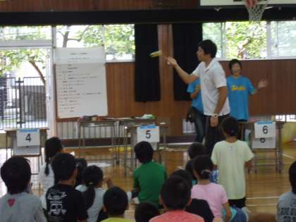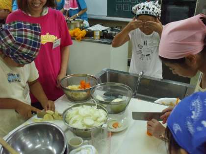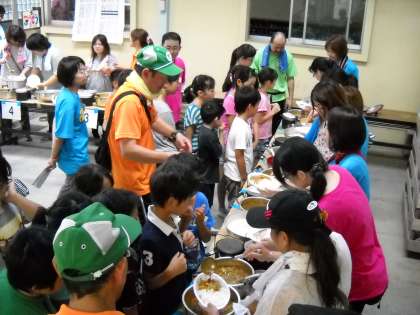 ゲームでは、玉村先生が素晴らしいけん玉の妙技を披露してくれました。そして、ゲーム終了後、昼食の用意です。たまねぎの処理に悪戦苦闘していましたが、みんなで力を合わせて作ったカレー。いよいよ完成したカレーとご飯を講堂前で、盛り付けてもらいました。