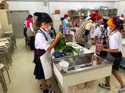 5年生では、家庭科で初めての調理実習です。今日のメニューは「ゆでたまご」と「ほうれん草のおひたし」です。