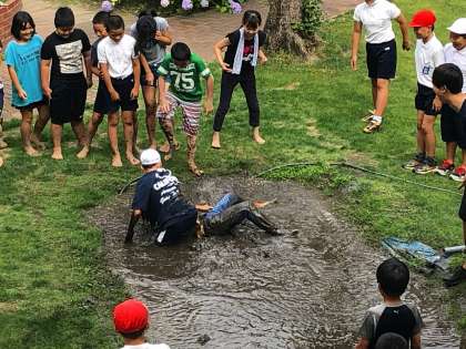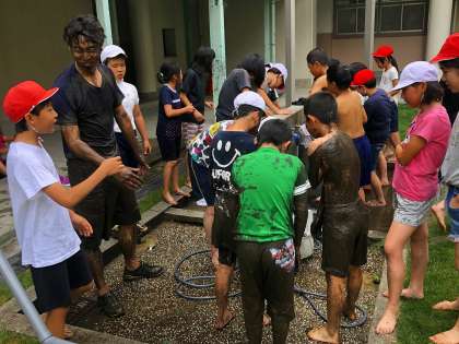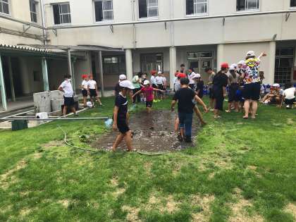5年生では、学校にある田んぼの代掻きを行いました。水を張った田んぼ土をさらに細かくして表面を平らにする作業です。最初は、泥に足を入れるときには、恐る恐るといった感じでしたが、最後の方は、全く気にすることなく、泥んこ相撲やダイブまでしていました。