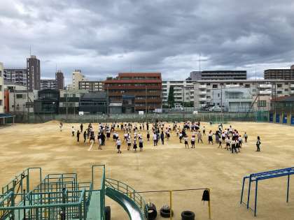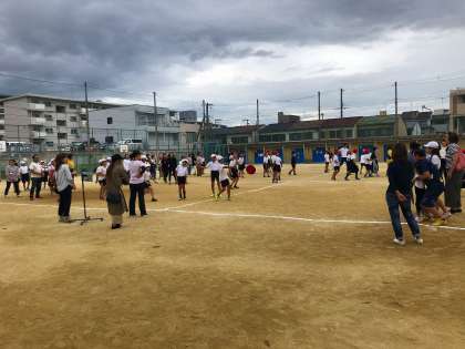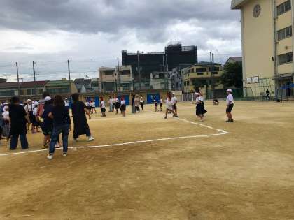 14日(金)に、5年生では「ふれあい活動」があり、親子でドッジビーをしました。この後、林間保護者説明会があるので、たくさんの保護者の方が参加されていました。