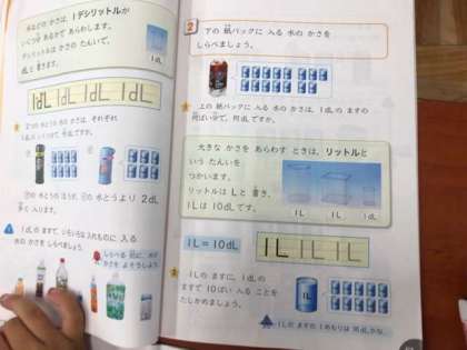 雨の7月1日。2年生の教室を順にみていきました。1組では、算数で「水のかさ」の学習です。私たちが子どものころは「リットル」は「L」と表記するのではなく筆記体で書いていましたが。(ここでは、表現できませんでした。)