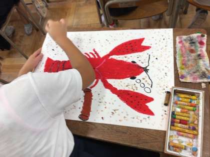 2組は、ザリガニの絵を描いていました。画用紙いっぱいに大きなザリガニを、クレヨンでしっかりと塗りこんでいました。