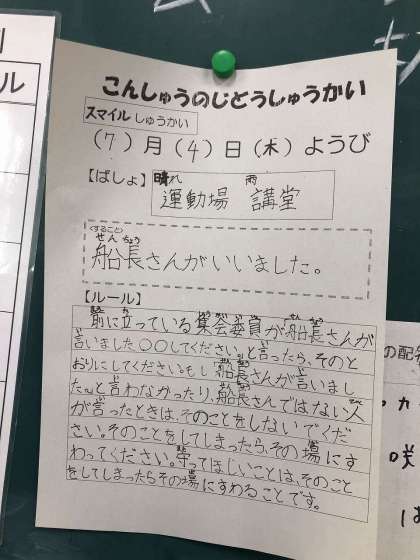 7月4日(木)のスマイル集会は、集会委員会によるゲーム「船長さんが言いました」です。このゲームは「船長さんが言いました」といった時だけ指示に従い、それ以外は指示に従ってはいけません。