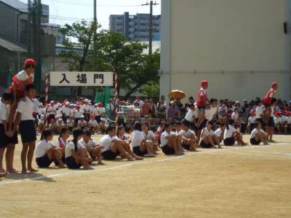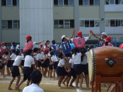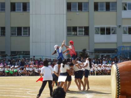 6年生の「騎馬戦〜高殿秋の陣〜」です。陣太鼓の合図で、1対1あり。団体戦あり。大将戦ありのバリエーションに富んでいました。