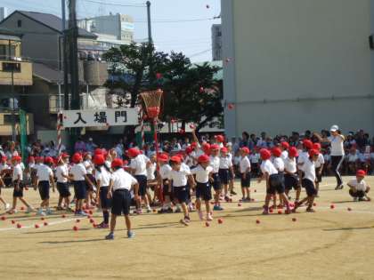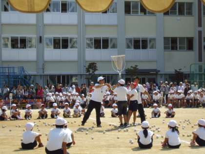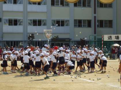 1年生の「みんなでたまいれ」です。終了のピストルが鳴っても、まだまだ赤白のたまが飛び交っていました。