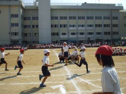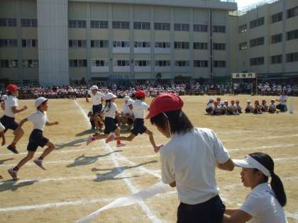 2年生の「GO!GO!2年生!!」です。ゴールを駆け抜ける姿は一流のアスリート並です。高学年になったら、楽しみだ。