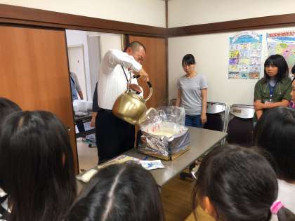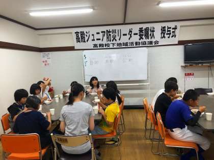 7月13日(土)に、高殿地区のジュニア防災リーダーの委嘱状授与式がありました。高殿地域活動協議会の会長様から、新しくジュニア防災リーダーになった子たち一人一人に委嘱状が手渡されました。