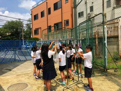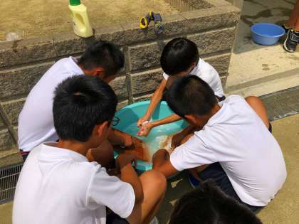運動場の隅で、6年生が洗濯をしていました。しかも、昭和を感じるたらいに洗濯板を使って手で靴下を洗っていました。