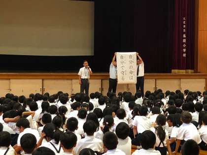 7月19日、今日で1学期が終わります。全校児童が講堂に集まり終業式が行われました。校長からは、「夏休みの間、不審者・災害・熱中症など命に関わることがあるかもしれません。自分の命は、自分で守る。」というお話がありました。