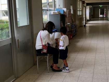 教室では、夏休みの生活について担任より話があり、「はばたき(通知票)」が一人ひとりに渡されました。1年生にとっては、初めての「はばたき」ですが、1学期にがんばったところをほめてもらいながら受け取っていました。