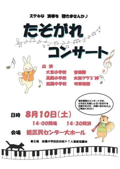 8月10日(土)にたそがれコンサートがあります。場所は旭区民ホールで、開始時刻は14:00からです。高殿小学校からも太鼓クラブ「絆」が出演します。入場無料ですので、お気軽にお越しください。
