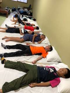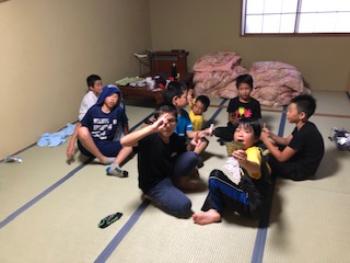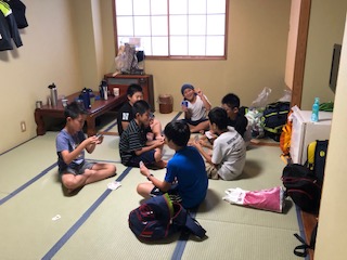 お風呂に入って、夕食までの部屋でゆっくりと過す時間です。カードゲームをして楽しく遊ぶ部屋あり、早々と布団を敷いて寝る練習?をする部屋あり。