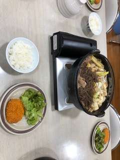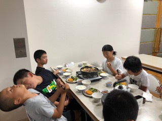 2日目の晩ごはんは、すき焼きです。食事係が昨日に引き続き手早く準備をして、いただきますの前にクイズを出題。