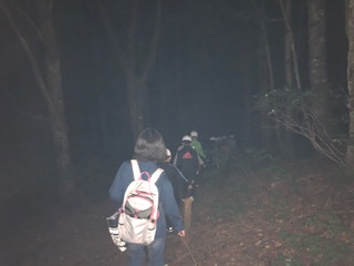 ナイトハイクができました。霧の中なので、更に暗さが増して、本当の真っ暗の中を歩く体験ができました。最後尾の私の五人前の子が「ヘビがいる」と叫び、しばらく確認。木の根っこだとわかって出発したが、集団から離れて、更に不安が増しました。