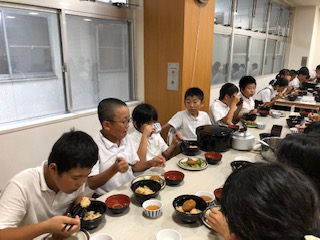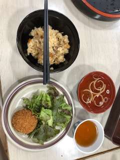 宿舎で食べる最後の食事です。メニューは、炊き込みご飯とミンチカツです。このあと、大阪に向けて、13時に出発予定です。