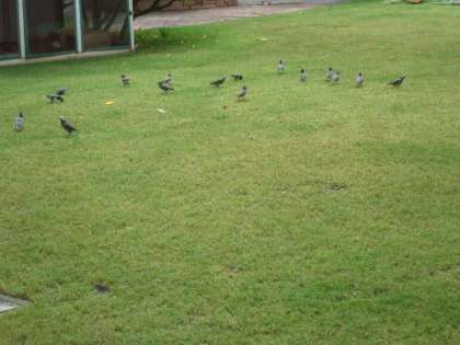 校内の点検に回っていたら、中庭には、たくさんのムクドリが芝生の上で何かをついばんでいました。おそらく、この台風の強風で落ちた木の実をせっせと食べていたのでしょう。ウサギ小屋の2匹は巣の中でじっと避難をしていました。