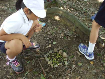おやつを持って行っていない私の手のひらには、「これも、これも」といろいろな人からのお恵みをのせてもらいました。そして、いたるところに“どんぐり”が落ちていました。誰が集めたか、小石で囲んだお皿にどんぐりが、かき集められていました。